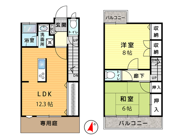 | 特長 | ★2LDKメゾネットタイプ★両面バルコニー★ロフト★庭付き★エアコン2基★収納豊富(大型クローゼット)★トイレ2カ所ウォムレット★浴室追い焚き可★独立洗面台 |